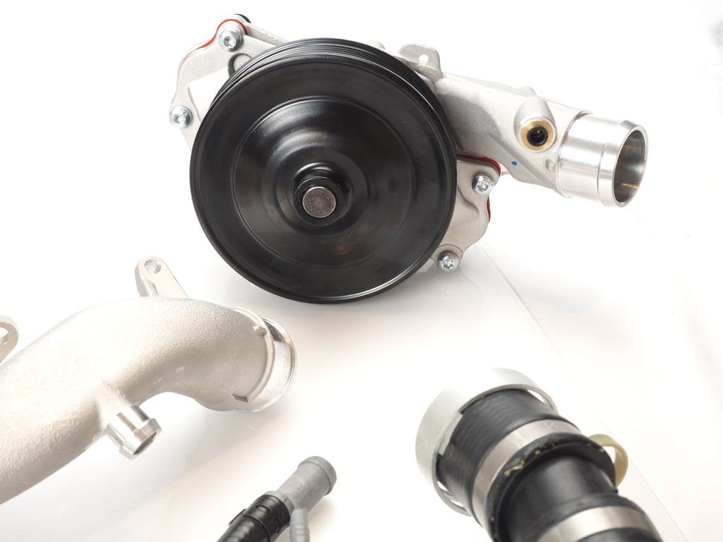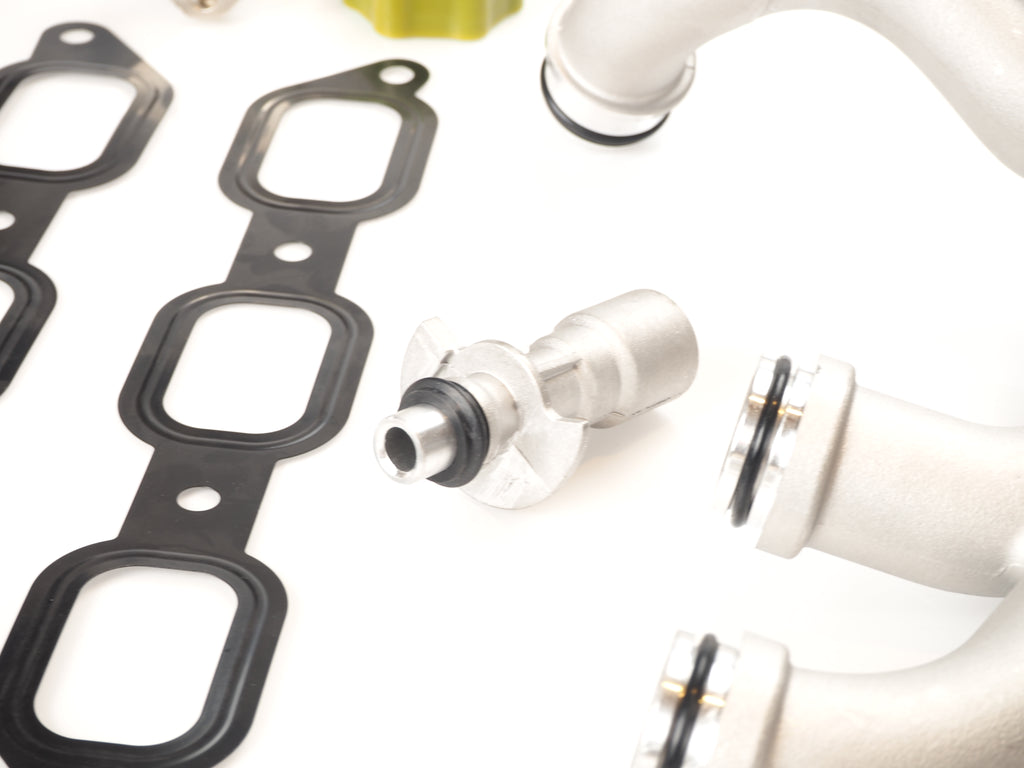Notes: The kit includes the Aluminum Thermostat without Sensor, Aluminum Coolant Crossover Pipes, Water Pump, and the Thermostat Outlet Hose with Brass Fittings, Brass Bleeder Screw, Crossover Plug, Aluminum Heater Manifold Pipe, Aluminum Oil Cooler Inlet Tube w/ 2 o-rings, ZZP Solid Supercharger Snout Coupler, and Intake Manifold Gaskets.