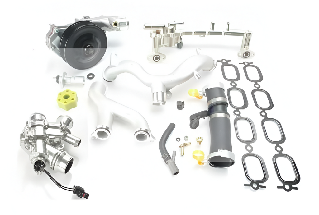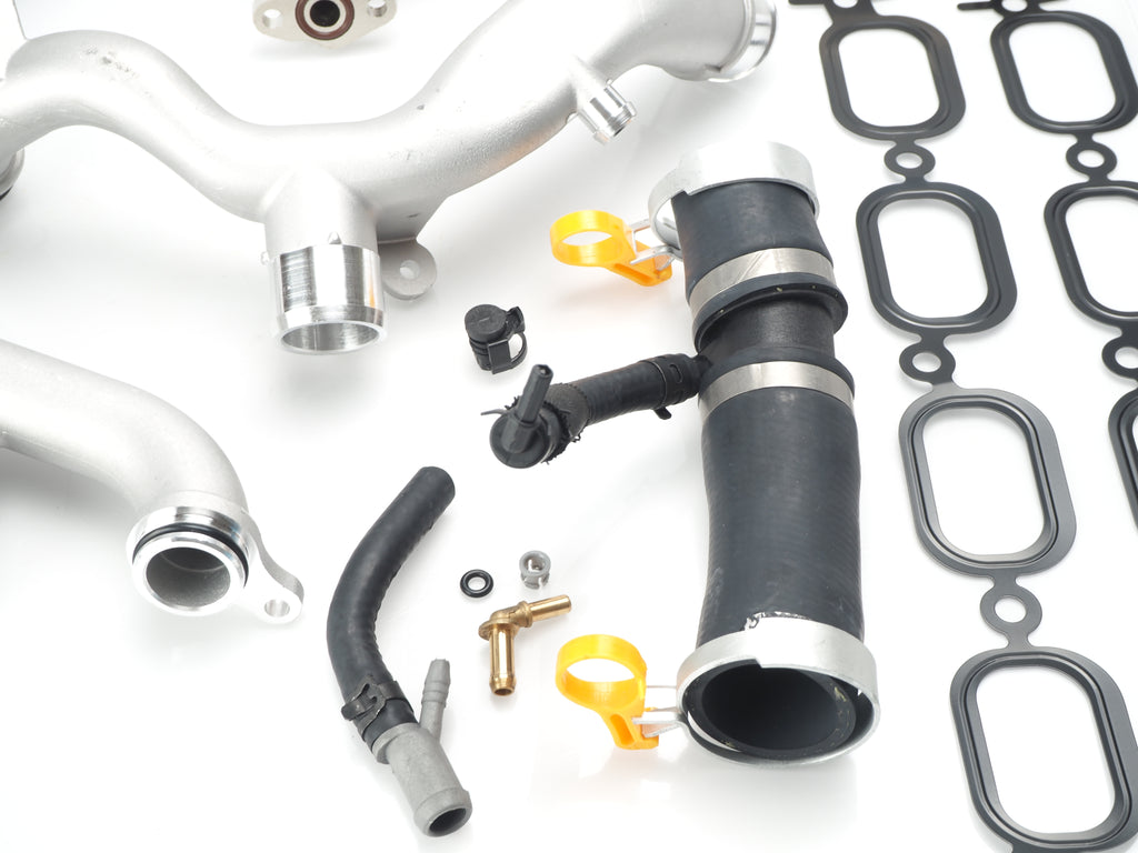 Notes: The Kit includes Aluminum Heater Pipe (Heater Manifold, Rear Crossover Pipe), Aluminum Front Crossover Pipe V2 (Y-Pipe, Front Pipe), Aluminum Thermostat, Mechanical Water Pump, Thermostat Outlet Hose (Upper Thermostat Hose, T- Hose), Brass and/or Plastic Water Pump Inlet (Brass Elbow, Brass Nipple), Brass Hose Bleeder Screw, Crossover Return Plug, Aluminum Oil Cooler Inlet Tube (Water Pump Tube), Solid ZZP Supercharger Snout Coupler, and Intake Plenum Gaskets (Supercharger Gasket, Intake Manifold Gasket)